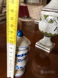 Antico e raro piccolo vaso da farmacia per opium (oppio) in maiolica di Bassano. Presenti sbeccature, 12 cmx5