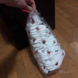 Piccolo albero di Natale decorazione in tessuto bianco con palline rosse e argento applicate, sferiche e a forma di stella.