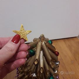 Piccolo albero di Natale decorazione fatto a mano con pennette di pasta dipinte di oro. Con campanellini colorati attaccati e stella gialla in cima. Base color viola.