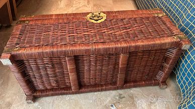 Piccolo baule in midollino crocco con angoli maniglie e chiusure in metallo dorato e piedini che lo sollevano da terra ; molto bello tenuto benissimo; lo puoi usare come contenitore o per i tuoi regali di natale ; misure 70x30 cm e altezza 30 ;