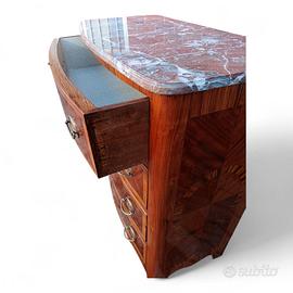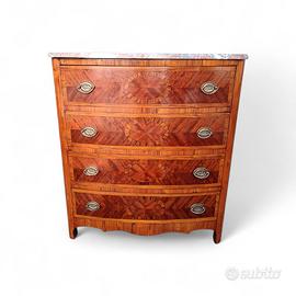 Questo cassettone in stile è un pezzo di arredamento di grande fascino. Realizzato in mogano e legno di rosa di pregiata qualità, presenta un piano in marmo che mette in risalto le venature naturali del legno. La struttura robusta e le linee eleganti sapientemente arricchite da eleganti giochi di tarsie lo rendono un complemento d'arredo perfetto per un ambiente classico e raffinato. Dotato di ampi cassetti , offre un'ottima capacità di contenimento per riporre con ordine oggetti e indumenti. Un mobile di grande valore estetico e funzionale, ideale per arricchire con stile la tua casa.