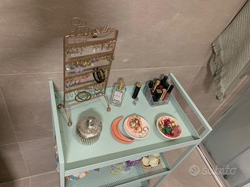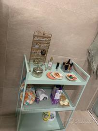Piccolo mobile a due ripiani per bagno o camera da letto, perfetto anche per disporre condimenti o piatti in cucina. Può essere fisso oppure è possibile aggiungere le 4 ruote incluse per spostarlo più facilmente. Molto pratico, occupa poco spazio. È in acciaio con vernice verde. Si possono riporre molte cose.