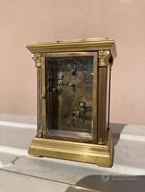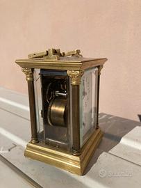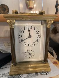 Vecchio orologio da appocchio di piccole dimensioni con sveglia. Meccanismo revisionato e perfettamente funzionante. Ha la sua chiave di carica. Presenta un paio di vetri sbeccati (laterale e posteriore, visibili in foto) e una rottura dello smalto nella parte superiore destra del quadrante.