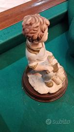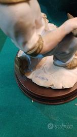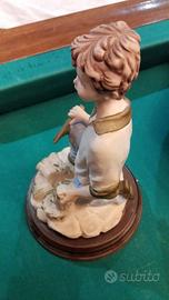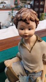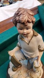 Informazioni Generali Autore: Scaggiari (firmato sulla base della porcellana). Periodo: Circa 1970 - 1980. Origine: Italia (Tradizione di Capodimonte). Soggetto: Giovane boscaiolo/taglialegna. Caratteristiche Fisiche Materiale: Porcellana "Biscotto" (finitura opaca, non smaltata). Base: Legno tornito color noce scuro. Altezza Totale: Circa 20 cm. Diametro Base: 13 cm. Tecnica: Modellazione artigianale con dettagli incisi a mano e pittura a pennello in tonalità tenui (pastello). Descrizione Artistica L'opera rappresenta un fanciullo in abiti rurali (camicia bianca, pantaloni azzurri risvoltati e scarponcini) colto nel momento del lavoro. La scultura si distingue per l'elevato realismo degli elementi naturali: La legna: I tronchi presentano venature realistiche e l'effetto della corteccia spezzata. L'attrezzo: Il ragazzo impugna un cuneo o una piccola scure con posa naturale. Espressione: Il volto è caratterizzato da grandi occhi azzurri e un'espressione serena, tipica della poetica "fanciullesca" di Scaggiari. Stato di Conservazione Integrità: Ottima (non si notano mancanze evidenti o incollaggi). Pulizia: Superficie pulita, porcellana priva di macchie di umidità.