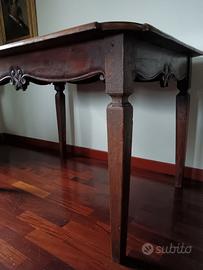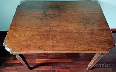 Uno splendido tavolo di misura contenuta, manifattura veneta del XVIII secolo, molto ben conservato, in legno di noce dalla tonalità calda, scolpito con piano sagomato. Gamba a tronco di piramide che ne dichiara il gusto di fine 1700. Nel restauro occorso alcuni anni fa sono stati mantenuti quei segni del legno che ne attestano l’età e l’usura, per evitarne l’effetto falsificante. Il tavolo può essere utilizzato anche come scrivania, porta collezioni, tavolo da centro, tavolo servitore o da gioco. Le misure contenute lo rendono ideale per spazi non necessariamente grandi. I segni d’usura o fori di vecchi tarli, fanno parte della bellezza del mobile antico.