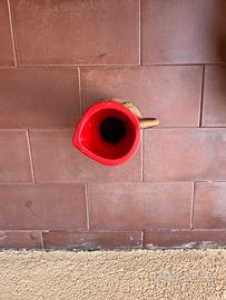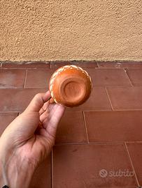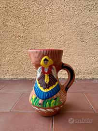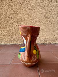 Piccolo vasetto/brocca in terracotta con decorazioni varie di donna e fiori, stile naïf, probabilmente souvenir di una regione con costumi tipici (può essere Spagna, Portogallo o anche Italia del centro-sud).