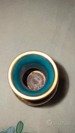 Vaso lavorazione cloisonnè, dimensioni cm. 10,5x 4,5 compreso basetta in legno. Nessun segno o lesione, pari a nuovo. Ideale anche per creazione bomboniere.