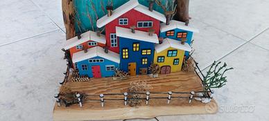 piccolo villaggio con casette in legno fatte a mano e pezzi di legno recuperati, recinto fatto con chiodi e pezzi di spago, alberelli di licheni e pezzetti di rametti secchi