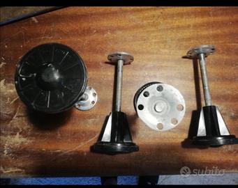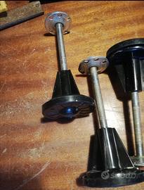 N° 4 Piedini con base in plastica, asta filettata per regolare l'altezza del piedino e flangia in acciaio con fori per il fissaggio al mobile o all'elettrodomestico. Lunghezza del filetto (M10) 11 cm