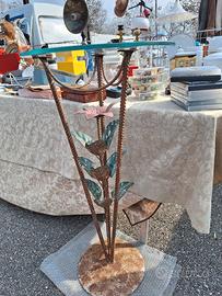 Piedistallo in ferro lavorato con motivi floreali smaltati e ripiano in vetro. Utilizzabile sia come porta-pianta, svuotatasche o anche solo come componente d'arredo. piccoli ed insignificanti segni del tempo, ma sostanzialmente in buonissime condizioni. L'oggetto è visionabile e ritirarle in zona Fondazione Prada.