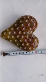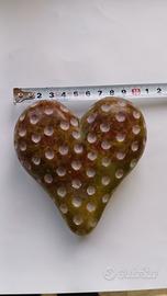 pietra decorativa a forma di cuore, con sfumature di colore beige e verde, caratterizzate da una lavorazione superficiale uniforme, con incisioni circolari, con piccoli fori o incavi circolari. Può essere utilizzata come soprammobile, fermacarte ecc......... Acquistata anni fa, durante un viaggio all'estero e poi sempre conservata in vetrina. Peso gr. 555, con misure cm. 11x11. Nuova, perfetta in ottime condizioni generali. Disponibile per altre informazioni o foto.