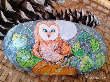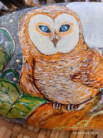 misura cm 22 x 12 circa. Rappresenta un rapace notturno adagiato su una zucca tra le foglie con la luna alle spalle.