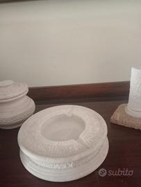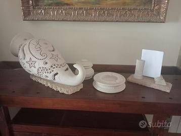 Grande Lampada di pietra mediterranea insieme a portacenere, portafoto e porta oggetti, tutti di pietra leccese. La lampada e tutta intagliata, una volta accesa, crea una bellissima atmosfera sulle pareti della stanza. Qualsiasi lampadina di colore di luce venga messa, ha davvero un effetto unico!Fantastica con arredamento antico, ottima anche con arredo moderno. Vendo tutti i pezzi insieme, o separatamente.