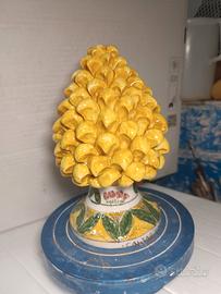 pigna Caltagirone H 20 decorata e realizzato internamente a mano colore giallo arancio e verde con particolari fiori e foglie rosso su base.