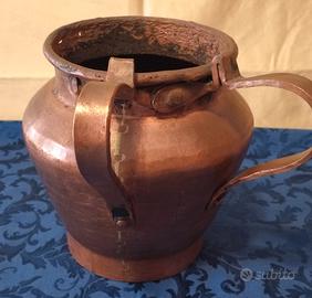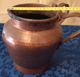 Pignata, brocca, per fagioli vintage/antica in rame massiccio databile intorno al 1920 - 1950 del secolo scorso. Dimensioni e fattezze lo collocano sicuramente in quello che è definito "Artigianato Abruzzese". Questo oggetto ha probabilmente più di 100 anni perché ha ancora una coda di pesce che si unisce in ottone sul fondo. Guarda le foto. Era usata vicino al fuoco con i fagioli dentro per cuocerli lentamente. Realizzato in Rame, i manici sono rivettati a caldo, mentre i due manici sono tipici di questo tipo di pentole. Si può notare come i due manici siano collegati alla pentola con giunzioni sovrapposte, e con rivetti ribbattuti a caldo il che è anche molto tipico di queste pentole. Diverse ammaccature sulla Brocca ne autenticano l'utilizzo nel corso dei decenni, così come la patina di ossidazione.