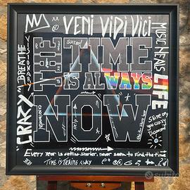 Al centro della composizione, la frase "TIME IS ALWAYS NOW" domina con forza, circondata da riferimenti iconici alla musica dei Pink Floyd, come l’arcobaleno prismatico e frasi tratte dai testi di brani storici: