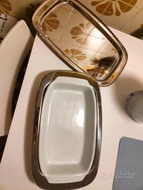Vendo elegante pirofila da forno in ceramica bianca (19 × 30 cm) completa di base/coperchio in acciaio inox, firmata Broggi, storica marca italiana di alta qualità.