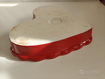 Pirofila in ceramica smaltata, forma a cuore, smerlato, esterno rosso. Misure come da foto, h. 4,5 cm. Oggetto poco usato (retro non smaltato leggermente scurito per l'uso in forno), ma perfettamente integro, nessuna scheggiatura. Come da foto.