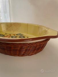 Porta un tocco di stile rustico e accogliente alla tua tavola con questa pirofila completa di supporto in vimini. Ideale per servire contorni, pane o piccole preparazioni direttamente a tavola.