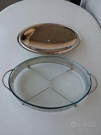 Vendo Pirofila in vetro da forno trasparente, con porta pirofila e coperchio in acciaio inox, ovale, marca Marinex originale, anni '80, usata 2 volte, tenuta perfettamente, come nuova, misure senza manici cm. 35x25, altezza totale con piedini e pomolo cm. 13. Si prega di contattare Graziano 340-4110406 dalle 10 alle 19. Si spedisce solo dopo eventuale bonifico + Spese di spedizione, oppure la merce va ritirata personalmente e pagata in contanti, a Vago di Lavagno (VR), o, tramite accordo nelle immediate vicinanze, max 10 km.