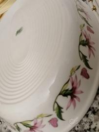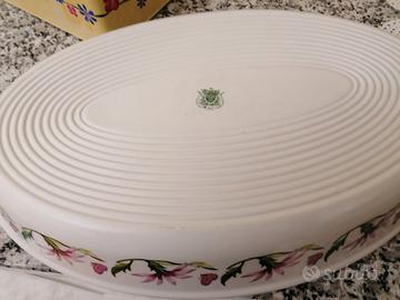 Condizione Nuovo 🌸 Descrizione dell’oggetto: Elegante piatto ovale in porcellana inglese da collezione, prodotto da Portmeirion e disegnato da Susan Williams-Ellis nel 1972. Parte della storica collezione The Botanic Garden, ispirata alle illustrazioni botaniche del XIX secolo.🦋 Motivo floreale e farfalle dai colori vividi, perfetto per arredamenti country chic o tavole curate. ✅ Made in England – autentico Portmeirion ✅ Condizione: Nuovo – mai usato, perfetto, senza difetti né segni d’usura 📐 Dimensioni: circa 30 x 22 cm (forma ovale)🎨 Un tocco di natura inglese nel cuore della Toscana. Ideale come piatto da portata, centrotavola decorativo o pezzo da collezione per amanti della ceramica vintage