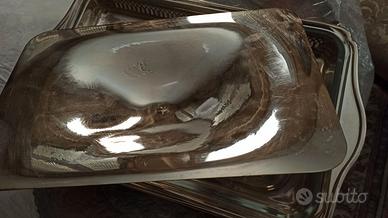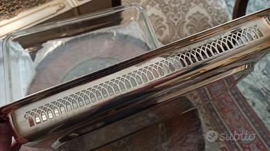 pirofila in silver plated, dotata di vassoio interno in vetro e coperchio. Misure compreso ingombro manici: 45x26x6 cm. Altezza compreso pomello coperchio 16 cm. Usata pochissimo ed in ottimo stato di conservazione.