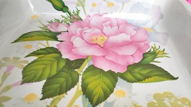 Una Porcellana da fuoco con elegante decoro floreale di rosa botanica centrale, foglie verdi e fiori di campo. Decoro riportato anche su bordo esterno.