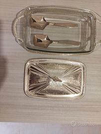 Pirofila vintage in acciaio placcato argento con casseruola in Pyrex. Oggetto elegante da portare anche in tavola. La composizione comprende: telaio in acciaio placcato argento, coperchio, pirofila in vetro Pyrex e due posate da portata. Misure: cm 37 x cm 20 x cm 10. L'oggetto è made in England. Nuovo senza cartellino.