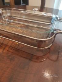 Splendida pirofila rettangolare in vetro borosilicato Pyrex originale, completa di elegante supporto in metallo argentato (silver-plated) e coperchio coordinato. Un classico del design da tavola degli anni '70/'80, perfetto per servire con stile lasagne, arrosti o contorni direttamente dal forno alla tavola.