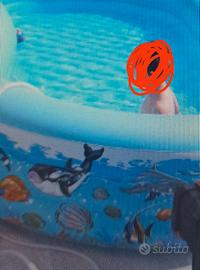 Piscina gonfiabile con fondo gonfiabile. Tutta la parte esterna presenta disegni di pesci, come da foto. Misure esterne indicative 3x2 h 60. Perfetta e super morbida.