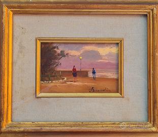 Franco Biondi (Livorno, 1932 – 1987) 10x15 con cornice dorata 22x27.. è stato un pittore figurativo appartenente alla tradizione livornese post-macchiaiola. La sua pittura unisce la sensibilità per la luce e il colore tipica della scuola labronica con un’attenzione al dettaglio e alla composizione. Oltre alle nature morte, spesso cariche di simbolismo e di atmosfere intime, Biondi ha dipinto "Mari poetici", paesaggi e soggetti classici, reinterpretando con delicatezza e originalità i temi della tradizione. Le sue opere mostrano un equilibrio tra osservazione realistica e un senso poetico della realtà, capace di evocare emozioni silenziose e suggestioni naturali. raccontano stagioni, rituali e la vita quotidiana con una sensibilità pittorica che va oltre il mero dettaglio, trasformando oggetti e animali in protagonisti di una piccola narrazione visiva. Franco Biondi, mari poetici, natura,paesaggi
