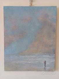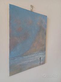 Vendesi pittura ad olio, 25x20 cm., su cartoncino telato, dal titolo "Remote viewing of a figure lost in the haze of far ancient clouds". (trad. italiano: "Visione remota di una figura persa nella nebbia di lontane nuvole antiche").