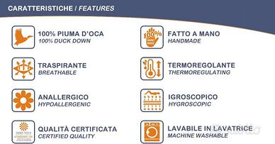 Categoria Punti Calore 4: (WARM) Caldissimo con 350 grammi/m2 di piuma d'oca naturale vergine.