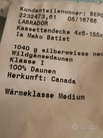 Vendo piumino letto singolo, misura 155x220 della ditta germanica Dormabell in piuma d'oca selvatica canadese. Sistema antiallergico e anticato Nomite, mai utilizzato, completo delle federe in Satin ( raso). Valore commerciale superiore ai 500 euro. Disponibile alla spedizione con aggiunta delle spese.