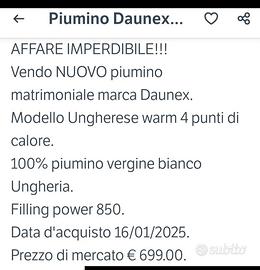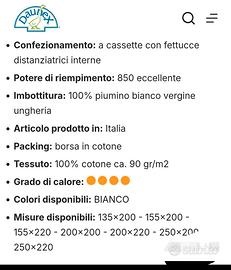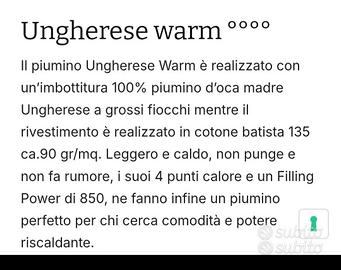 Vendo per doppio regalo e inutilizzo Piumino Ungherese Warm realizzato con imbottitura 100% piumino d'oca madre ungherese, a grossi fiocchi, realizzato,