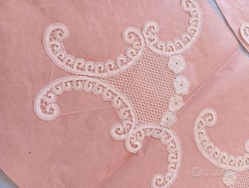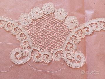 Elementi in pizzo Cantù fatti rigorosamente a mano in cotone bianco. Il tutto si compone di 4 pezzi per angoli, 6 pezzi da intermezzo ed un pezzo centrale di circa cm 60 di diametro. Applicabili su lino per copriletto matrimoniale o per tenda o per tovaglia. I pizzi sono ancora imbastiti su carta come usciti dalle mani dell' artigiana