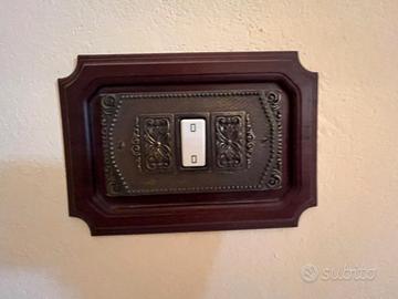 vendo Placche supporti prese interruttori stile antico / vintage con cornice in legno massiccio e e placca centrale decorata effetto ferro battuto.
