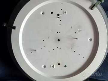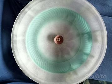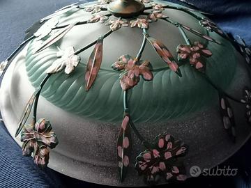 Plaffoniera in vetro e ferro battutto, con decoro floreale che include foglie e fiori. La base è in vetro satinato, la montatura in ferro battutto è lavotata a mano e dipinta in tonalità verdi e rosa.