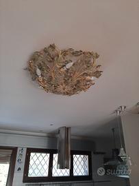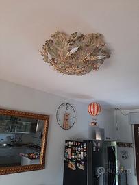 vendo plafoniera da soffitto 6 luci in ferro lavorato a mano e dipinto con foglie di edera e gocce di cristalli con fiori rosa, diametro cm.80 peso 8 kg. lavorazione artistica pregiata.
