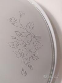 Plafoniera bianca in vetro satinato con disegni floreali, tenuta in ottimo stato. Monta lampadina fluorescente attacco G10Q. Diametro 40 cm.