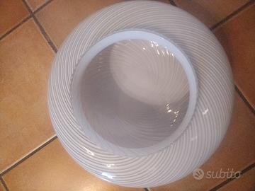 Vendo magnifica lampada da soffitto in Vetro di Murano, acquistata nel 1985. Un pezzo originale di metà anni '80, perfetto esempio di design veneziano che unisce tradizione artigianale e linee intramontabili. Il diffusore è realizzato a mano con la tecnica della mezza filigrana a spirale (effetto "Vortice"): i fili di vetro lattimo bianco creano una trama ipnotica che garantisce una diffusione luminosa omogenea e raffinata. Dettagli: Dimensioni Rare: Diametro importante di 48 cm, ideale per chi cerca un punto luce scenografico per ambienti spaziosi. Condizioni: Ottimo stato conservativo. Il vetro è integro, privo di sbeccature o opacizzazioni. Componenti originali: Completa della sua montatura dell'epoca in metallo bianco e portalampada in ceramica originale. Versatilità: Un classico del design che si integra perfettamente sia in contesti di modernariato che in arredamenti contemporanei. Misure: Diametro: 48 cm Prezzo: € 320,00 trattabili