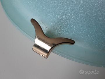 Vendo per inutilizzo plafoniera da soffitto con diametro di 30 cm, caratterizzata da elegante vetro color verde acqua e ganci metallici dorati.