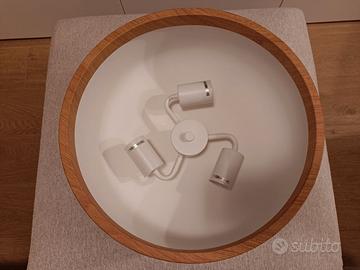 Plafoniera in ferro effetto legno chiaro, marca Sklum. Vendo perché acquistata assieme ad un altro prodotto per scegliere il migliore per il mio soggiorno. Presenta una lievissima rientranza sul margine inferiore di uno dei lati, si tratta di un paio di millimetri e non è un dettaglio che si nota una volta montata in alto, più che altro al tatto.