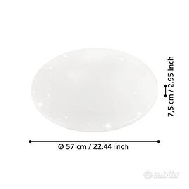 Acquistata ma confezione mai aperta Plafoniera LED GIRON-S è composta da una base in metallo bianco e un plafone rotondo in plastica decorato con effetti cristallo ad effetto "cielo stellato". Attraverso il telecomando integrato è possibile abbassare le luci e modificare la luce da bianco caldo, neutro e freddo e impostare la luce notturna e il timer. Stile plafoniera moderno, offre un’illuminazione particolare in ogni ambiente, che sia la cucina, il soggiorno, la camera da letto o corridoio. Altezza:7,5 cm Diametro:57 cm Lumen completo:4.300 Kelvin completo:3000 / 4000 / 5000 Materiale struttura:acciaio Materiale diffusore:policarbonato effetto cristal Colore diffusore:bianco Funzioni: dimmerabile, funzione di memoria, luce notturna, Telecomando