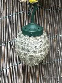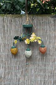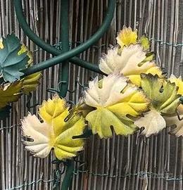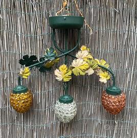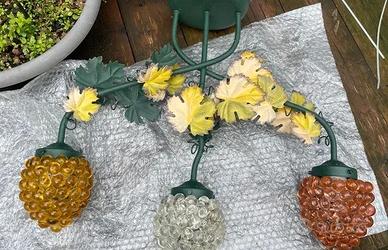 Bellissima ed particolare plafoniera in ferro verniciato unica nel suo genere, con un design ispirato alla natura, con foglie di vite e bicchieri in composizione artigianale di palline di vetro in 3 colori (ambra / bianco / rame), perfetta per aggiungere un tocco di stile in un ambiente rustico o un casale o un bed&brekfast. - Struttura in ferro vernicito verde a 3 luci. - Decorazioni a forma di foglie di vite. - Lampade in vetro con finitura a grappolo.