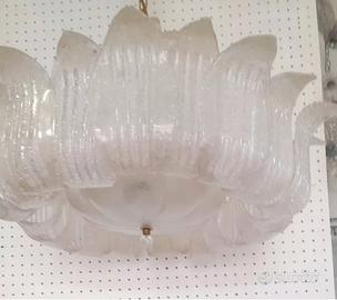 Bellissima plafoniera in vetro di Murano con graniglia interna per un effetto di riflessi di luce, colore cristallo, graniglia bianca, monta 5 lampade E 14. Ha un diametro di 70 cm e un'altezza di 46 cm, con possibilità di regolare l'altezza tramite la catena color oro, la quale volendo può essere rimossa per il fissaggio diretto al soffitto.