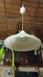 Plafoniera in vetro temperato con disegni in rilievo tenuto molto bene..comprensivo di filo e gancio ad occhiello per appenderlo al soffitto.. li tolgo per cambio arredamento. Diametro 30 cm