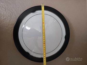 Plafoniera in metallo e vetro ceramica. Colori nero e bianco. Monta due lampadine comuni come si vede in foto.Diametro 36.
