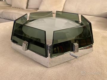 Grande lampada da soffitto Veca per Fontana Arte anni ‘70 con struttura esagonale in acciaio ed elementi in vetro verde Nilo e bianco satinato. Internamente ha tre punti luce.