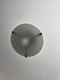 Questa lampada da soffitto (plafoniera) presenta un design geometrico basato su una forma circolare regolare a bassa sporgenza. Il diffusore è realizzato in vetro satinato bianco e si caratterizza per una lavorazione superficiale a cerchi concentrici incisi, che partono dal centro per estendersi verso il bordo esterno. Questa particolare finitura permette di rifrangere la luce in modo graduale, garantendo un'illuminazione diffusa e uniforme che riduce le zone d'ombra. Il vetro è sostenuto da tre supporti metallici a "L" con finitura nera opaca, posizionati a 120 gradi lungo la circonferenza, che ancorano il diffusore alla montatura interna fissata a plafone. La struttura è progettata per ospitare un punto luce centrale, la cui luminosità viene ammorbidita dallo spessore e dalla satinatura del vetro.